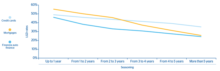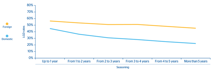 • The seasoning of a transaction is the period elapsed from the origination of the contract to the default date. This is also relevant, as there is an inverse relationship between LGD and seasoning: the longer the contract persists without defaulting, the greater its recovery.