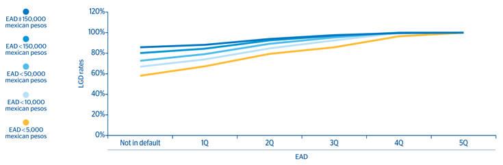 • Time elapsed between the default event and EAD (exposure at default). There are portfolios in which LGD depends on several axes, as is the case of credit cards in BBVA Bancomer, where the LGD grows with the time in default and the greater the amount of EAD.
