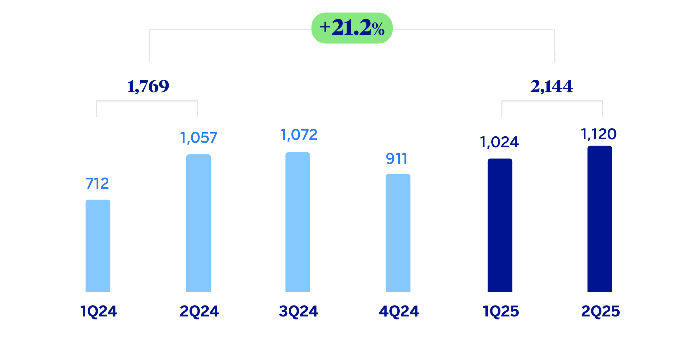 Spain generated a net attributable profit of €2,144m in the first half of 2025, which is 21.2% above the result achieved in the same period of 2024, driven by the evolution of all components of the gross income.