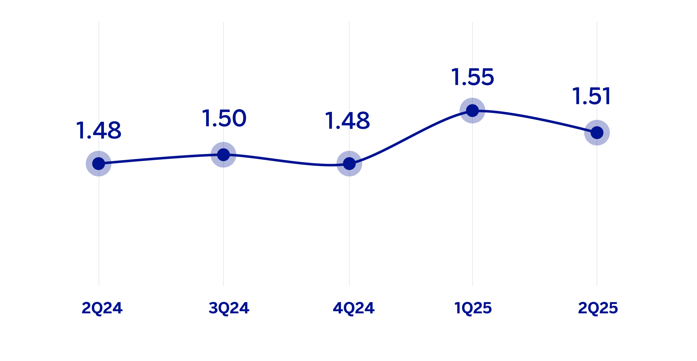 Regarding credit quality, the NPL ratio stood at 3.5%, a decrease of 2 basis points compared to the end of March, supported by the strong growth in activity and the good dynamics in the mortgage portfolio, which contributes to the increase in the coverage ratio by 75 basis points to 61% at the end of June 2025.