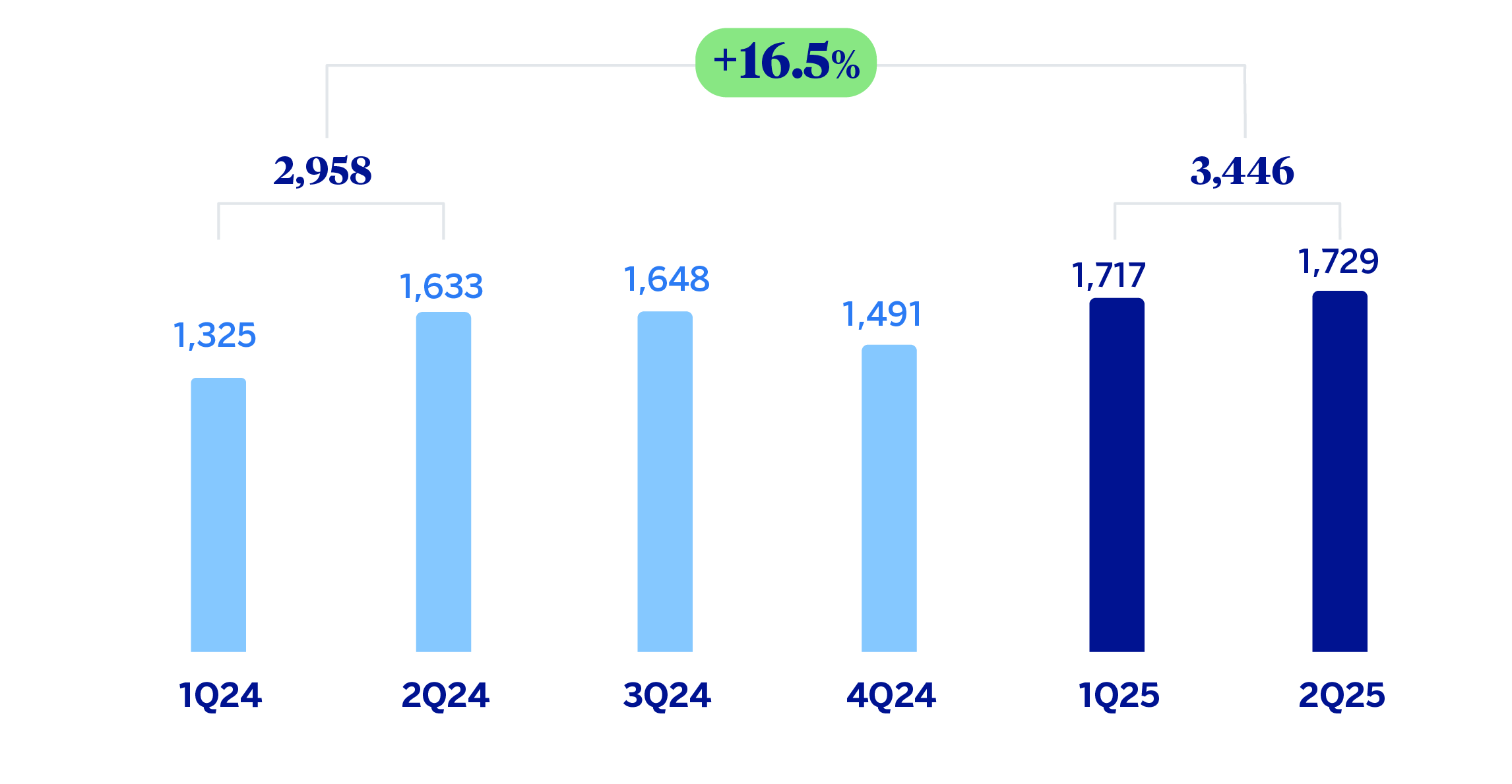 Lending balances were 5.2% higher than at the end of December 2024, driven again by the performance of the larger corporate segments (+7.1%), the public sector (+30.0%) and, to a lesser extent, by all consumer credit and credit cards (+3.2%).