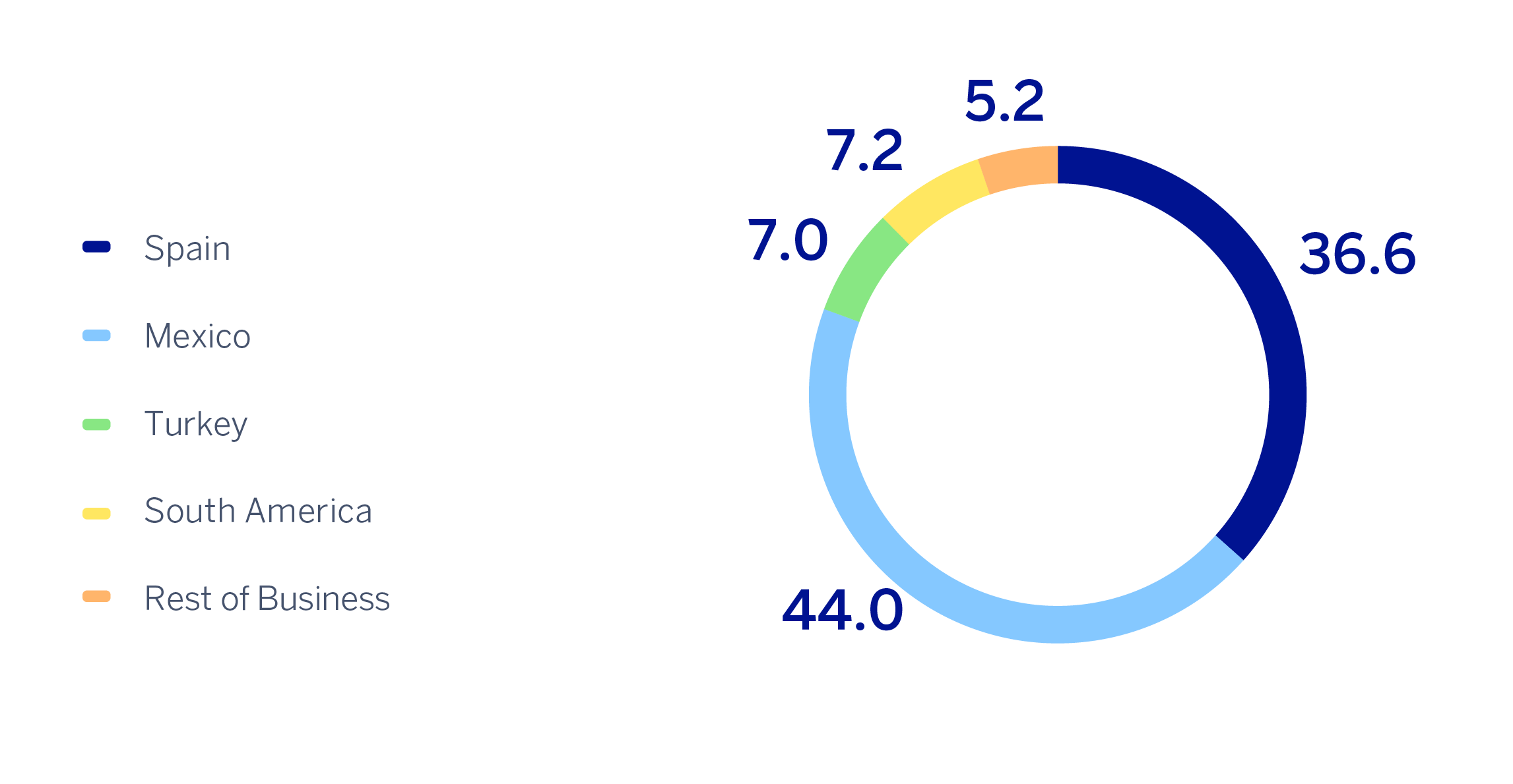 BBVA Mexico achieved a cumulative net attributable profit of €2,578m, which represents a year-on-year growth of 6.3%, excluding the impact of the Mexican peso, mainly due to the evolution of the net interest income.