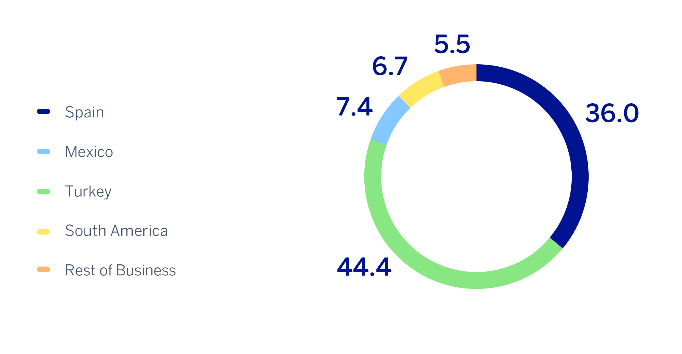 Turkey reached a net attributable profit of €648m, with a year-on-year growth of 49.6%, as a result of the good performance of recurring revenues in banking business and a less negative hyperinflation impact.
