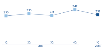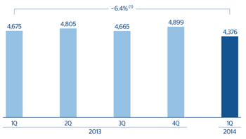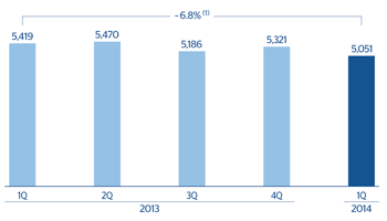 - The other operating income and expenses heading includes the adjustment for hyperinflation in Venezuela, which in the first quarter of 2014 was slightly more negative than in the same period of 2013. It should also be noted that in the fourth quarter of 2013 this heading included the extraordinary payment to the Spanish Deposit Guarantee Fund (FGD), in compliance with Royal Decree-Law 6/2013.