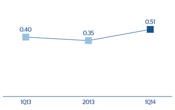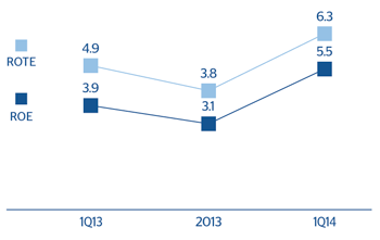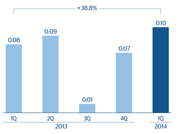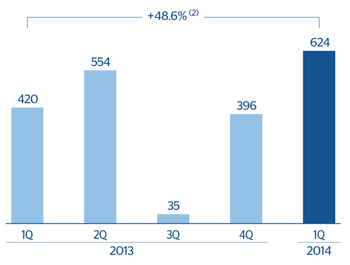 As a result, BBVA has concluded the first quarter of the year with a net attributable profit of €624m, 60.5% down on the same period in 2013 (at constant exchange rates), due to corporate operations accounted for in the first three months of 2013. Excluding this effect, the Group’s profit more than doubles that for the same period in 2013 (up 129% at constant exchange rates).