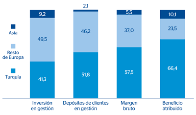 Eurasia genera un beneficio atribuido acumulado a marzo de 2014 de 105 millones de euros, lo que supone un aumento interanual del 3,1%. El 66% de esta cifra procede de Turquía, el 23% del resto de Europa y el 10% de Asia.