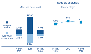 Como consecuencia de tal desempeño de ingresos y gastos, el margen neto del Grupo se comporta favorablemente y avanza en los últimos doce meses un 6,0% a tipos de cambio constantes, tras varios trimestres en los que mostraba tasas de variación interanual negativas. Por su parte, el ratio de eficiencia mejora respecto al del cierre del ejercicio 2013 (51,7% frente a 52,3%, respectivamente).