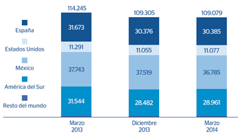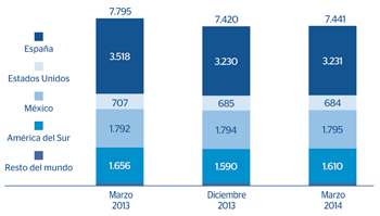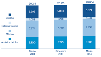En cuanto a la evolución del número de empleados, oficinas y cajeros automáticos, en la comparación interanual hay que tener en cuenta las ventas de BBVA Panamá y del negocio previsional en Latinoamérica a lo largo de 2013, así como las inversiones llevadas a cabo como consecuencia de los planes de transformación y expansión puestos en marcha, principalmente, en Latinoamérica (con aumentos, sobre todo, en cajeros automáticos).