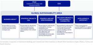 The implementation of the Sustainability strategy, approved by BBVA’s corporate bodies, requires cross-functional integration at the executive level. For this implementation, the Group has a Global Sustainability Area, whose head reports directly to both the Chairman, regarding transformation and sustainability strategy, and the CEO, regarding business matters.