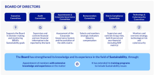 Within the framework of the Group’s overall management and control structure, the Board of Directors has approved the Strategic Plan for 2025-2029, which includes, as one of its six strategic priorities, “Boost sustainability as a growth engine”. In this regard, the Corporate Bodies are promoting the integration of Sustainability, encompassing ESG aspects, into all of the Group’s businesses and activities from a global perspective, and ensuring the appropriate management of the material impacts, risks, and opportunities arising from it.